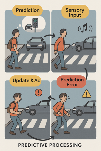 Before crossing a busy road, your brain continuously prepares itself for how to cross the street. This involves steps such as receiving visual and auditory sensory input in the form of traffic signals, signs, boards, approaching vehicles, honking, and the sound of accelerating engines. The brain then compares these sensory inputs with previous experiences, makes predictions based on reality, and improvises based on the situation—resulting in safe action.